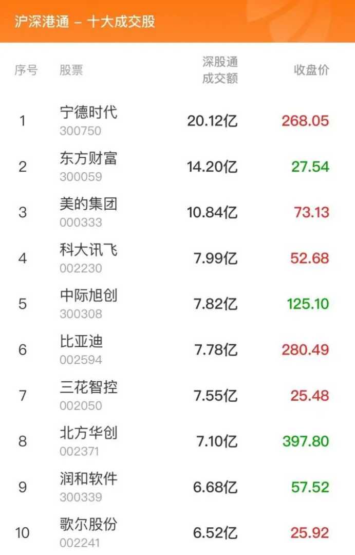 根据交易所公布的当日沪深港通十大成交股数据,药明康德、赛力斯、贵州茅台位列沪股通前三名,成交额分别为23.36亿元、11.84亿元和11.1亿元;宁德时代、东方财富、美的集团则位列深股通前三名,成交额分别为20.12亿元、14.20亿元和10.84亿元。