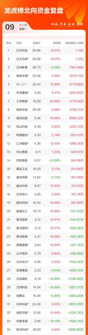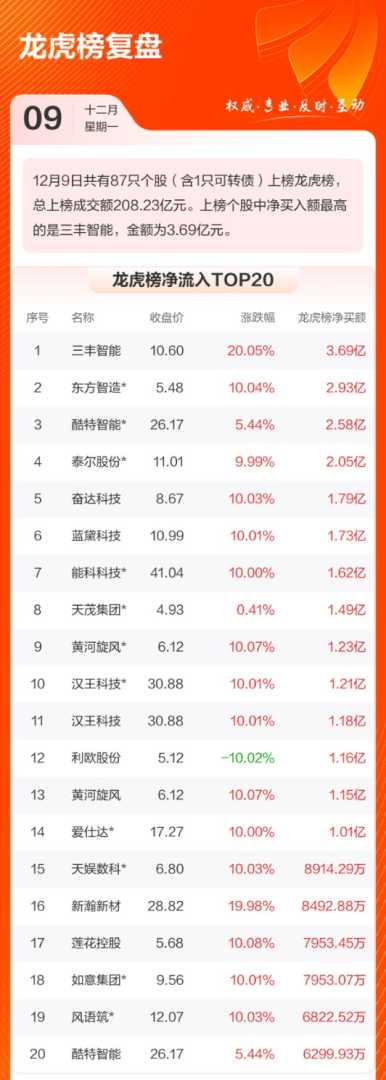 12月9日,共有87只个股(含1只可转债)上榜龙虎榜,总上榜成交额达到208.23亿元。其中,净买入额最高的个股为三丰智能,金额为3.69亿元。
