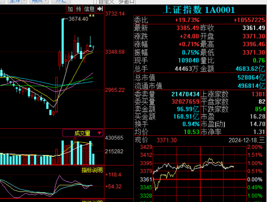 12月18日,A股市场三大指数在成交量缩减的背景下呈现反弹态势。上证指数、深证成指及创业板指分别报收3382.21点、10584.27点和2202.14点,涨幅分别为0.62%、0.44%和0.04%。全天成交额为1.36万亿元,较前一交易日减少1498亿元。