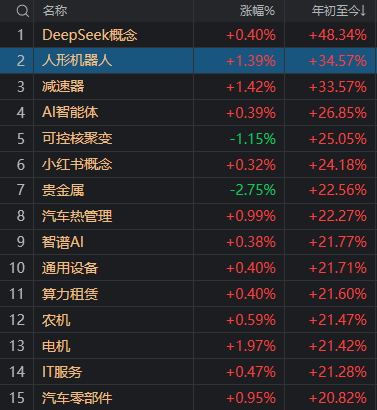 受缩量影响,三大指数午后回落短暂翻绿,短线情绪受影响。年内涨幅居前的板块如人形机器人、减速器概念大多飘红。