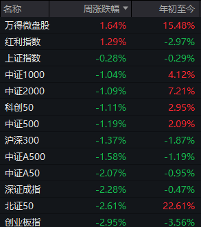 主要股指中,微盘股和红利指数本周表现相对较强,其余则普遍收跌。
