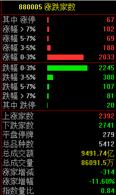 市场成交清淡,沪深两市全天成交额仅9147亿元,创下近期新低。个股方面,涨跌互现,2392只个股上涨,涨停个股达67只;而下跌个股则有2741只。