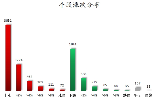 个股涨跌方面,截至收盘,沪深两市合计3031只个股上涨,1941只个股下跌,平盘个股157只,停牌的个股18只。不含当日上市新股,共有72只个股涨停,35只个股跌停。