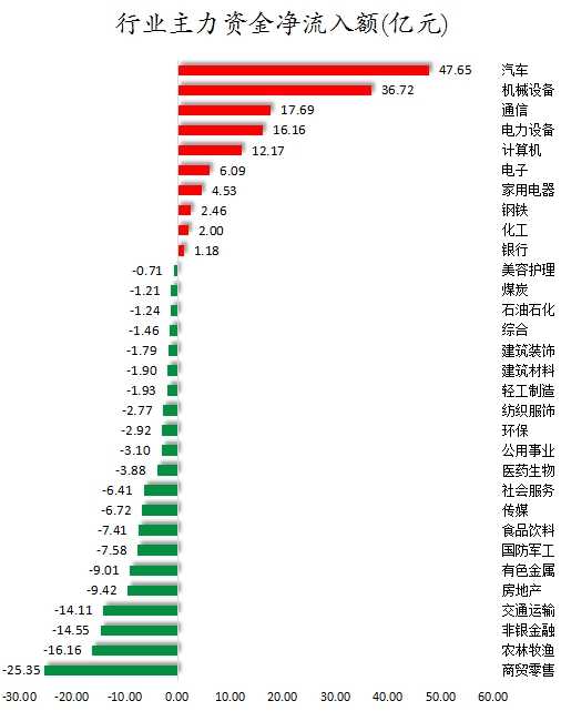 从行业来看,31个一级行业中,今日有10个行业主力资金呈现净流入,汽车行业净流入最多,为47.65亿元;机械设备、通信、电力设备等也净流入较多。21个行业主力资金呈现净流出,商贸零售行业净流出最多。