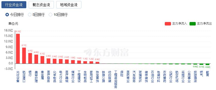 行业板块表现分化,航运港口、光伏设备、银行等板块涨幅居前,而航天航空、船舶制造等板块跌幅居前。资金面上,光伏设备净流入16.29亿,成为市场热点。