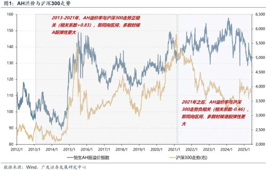 A股与港股的相对弹性在2021年前后发生变化。2013-2020年,AH溢价率与沪深300指数走势正相关(相关系数+0.83),即A股多数时候弹性更大,AH溢价收敛主要发生在市场下跌阶段;2021年至今,两者走势负相关(相关系数-0.46),港股弹性增大,AH溢价收敛主要发生在市场上行阶段。2024年以来,AH溢价修复同样发生在市场上涨或企稳阶段。