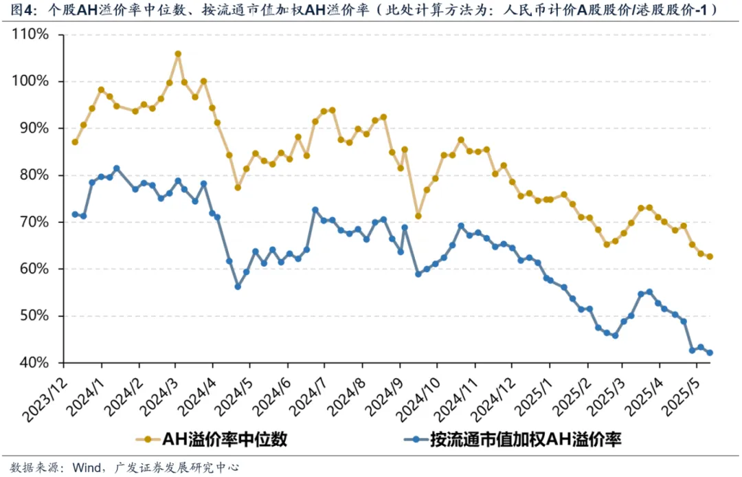 从个股中位数及流通市值加权指标看,去年11月后AH溢价率呈现明显收窄趋势。银行、非银金融、石油石化市值占比近60%,直接决定整体法计算结果。但今年港股成长股大涨,也助力缩小AH市场价差。