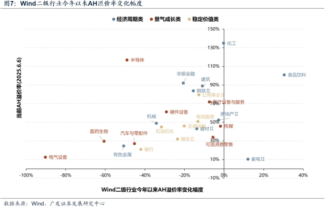 行业自身来看,溢价率收窄最显著的前五行业为电气设备、医药生物、有色(黄金)、半导体、汽车,多为景气成长行业。传统高分红行业收窄情况位于第二梯队,包括银行、石油、煤炭。顺周期行业整体溢价收窄不明显。