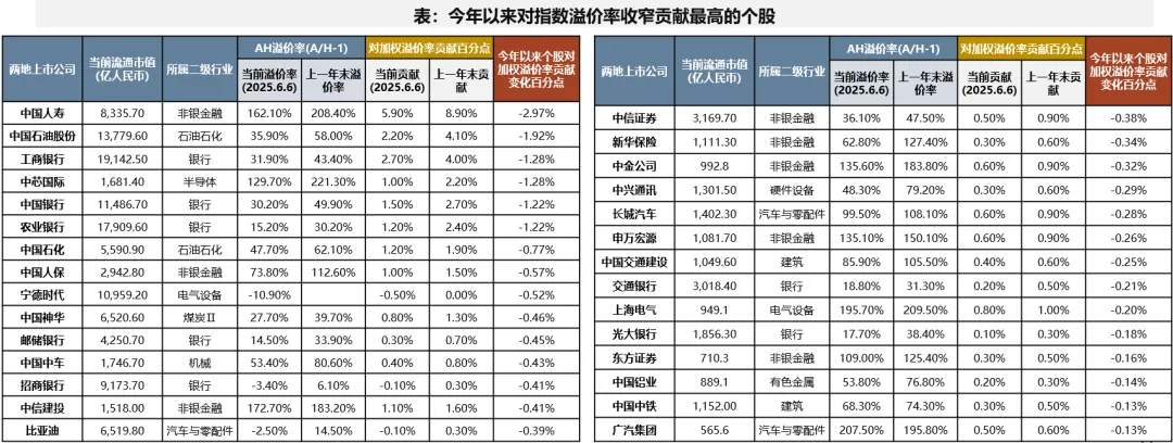 (二)行业贡献方面,金融股仍为权重,但成长股AH溢价率收窄同样显著