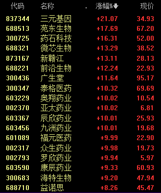 早盘,医药板块持续走强,申万医药生物指数半日上涨1.73%。创新药与CRO方向涨势突出,奥翔药业、亚太药业、九洲药业等多股涨停;恒瑞医药继昨日涨停后,今日继续上涨超过3%。