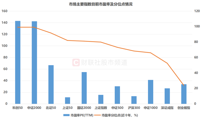 其余主要指数方面,科创50、中证2000指数市盈率双双超100倍,北证50、国证2000等指数市盈率也相对较高,而上证50、沪深300、上证指数等相对较低。