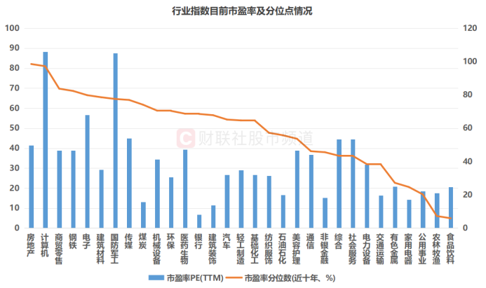行业指数方面,房地产、计算机、商贸零售等板块目前市盈率近十年分位点居前,而食品饮料、农林牧渔等板块目前估值较低。