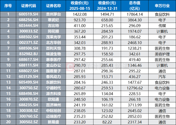 注:目前股价居前的个股(截至8月15日数据,不计算年内新股)