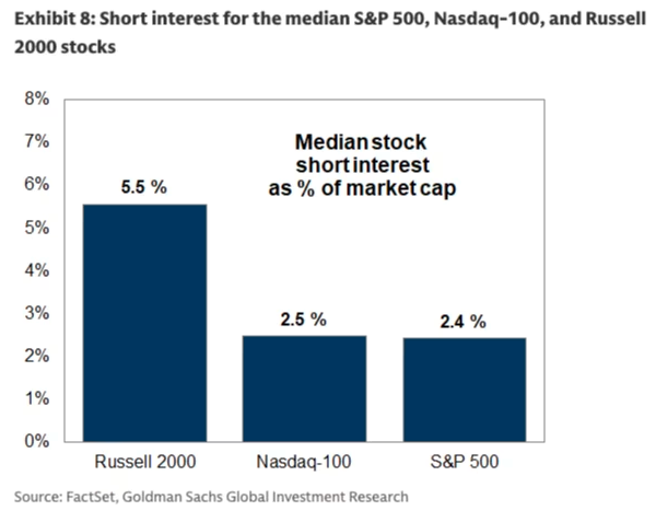在不同的指数方面,以科技股为主的纳斯达克100指数目前的空头比例比标普500还要略高,为2.5%。当然,空头最多盘踞的还是小盘股,罗素2000指数成分股的空头比例中位数目前高达5.5%。