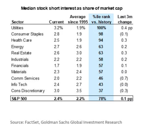 该板块的空头比例上升了0.3个百分点至3.2%。虽然看上去也不算特别高,但据高盛数据显示,这已创下该板块历史最高水平之一。