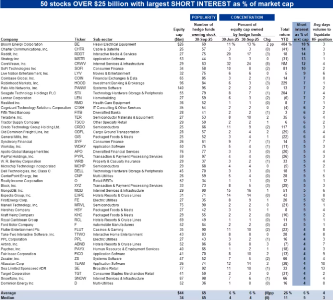高盛名单上的其余被做空最严重个股,包括了Strategy、CoreWeave、Coinbase、Live Nation、Robinhood和Apollo等。