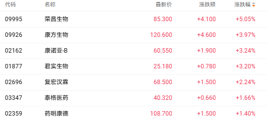 医药股今日强势领涨。截至收盘,荣昌生物(09995.HK)涨5.05%、康方生物(09926.HK)涨3.97%、复宏汉霖(02696.HK)涨2.24%。