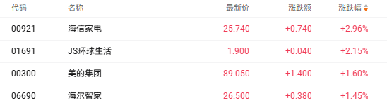 家电股同样表现抢眼。截至收盘,海信家电(00921.HK)涨2.96%、JS环球生活(01691.HK)涨2.15%、海尔智家(06690.HK)涨1.45%。