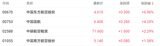 航空股今日表现活跃。截至收盘,中国东方航空(00670.HK)涨6.96%、中国国航(00753.HK)涨4.20%、中国南方航空(01055.HK)涨1.58%。