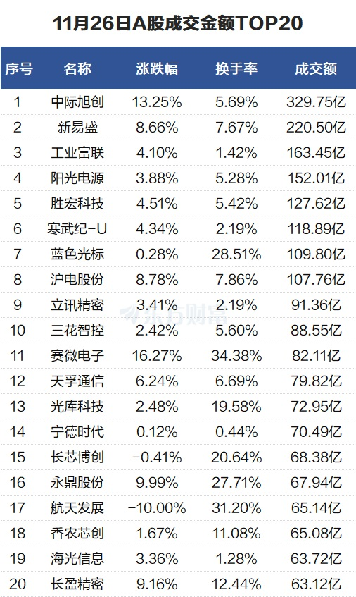 11月26日,上证指数微跌,深证成指强势上涨,创业板指领涨。两市成交额1.78万亿元,中际旭创当日成交329.75亿元。新易盛当日成交220.5亿元。当天换手率最高的个股为大鹏工业。