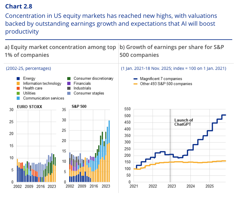 欧洲央行在报告中表示,美国股市自4月低点以来的回升主要由科技及其他与人工智能相关的公司推动,导致市场集中度创下新高。自4月8日以来,美国“七巨头”上涨了58%,同期其余的标普500成分股仅上涨了24%,导致标普指数市值前1%的公司现在占到市场总值的30%。