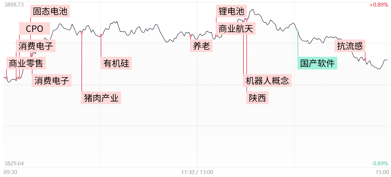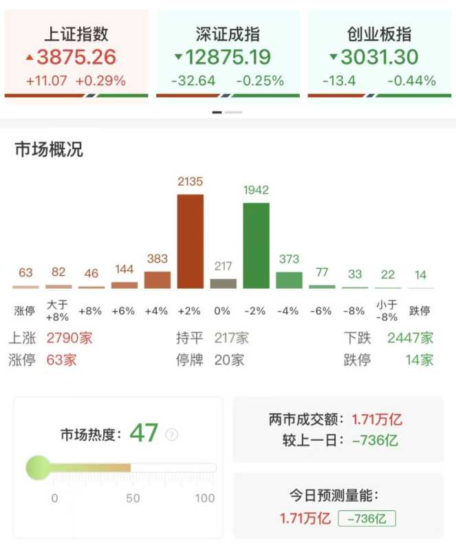 财联社11月27日讯,市场冲高回落,三大指数涨跌不一,创业板指、深成指先后翻绿,创业板指此前一度涨超2%。沪深两市成交额1.71万亿,较上一个交易日缩量736亿。盘面上,市场热点快速轮动,全市场超2700只个股上涨。从板块来看,锂电池概念爆发,壹石通20cm涨停,石大胜华涨停,华盛锂电涨超15%。消费电子板块走强,福日电子、科森科技等多股涨停。大消费板块走强,茂业商业3连板,海欣食品、广百股份双双2连板。下跌方面,AI应用概念持续分化,欢瑞世纪、石基信息均跌停。截至收盘,沪指涨0.29%,深成指跌0.25%,创业板指跌0.44%。