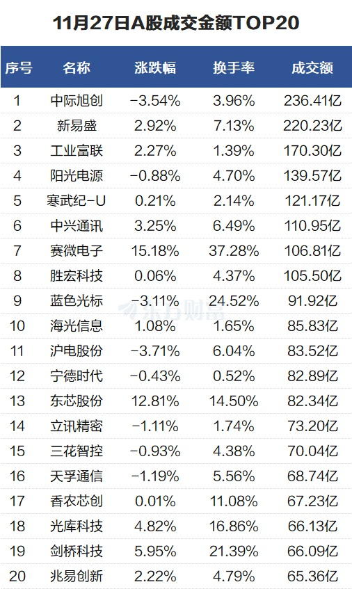 11月27日,上证指数微涨0.29%,沪深成交额较上一交易日缩减736亿元。当天N南特和南网数字换手率领先。