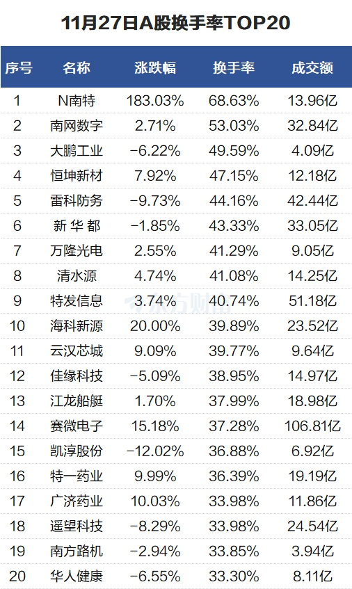 当天换手率最高的个股为N南特,全天换手率68.63%。南网数字紧随其后,全天换手率53.03%。