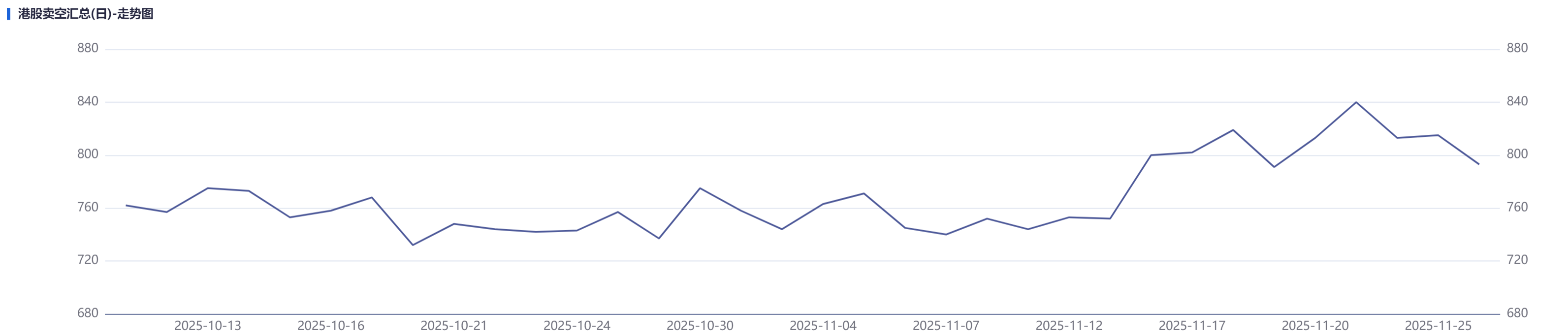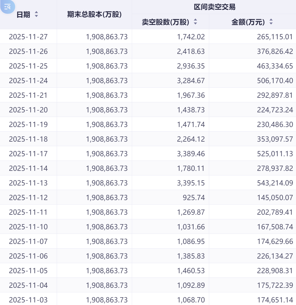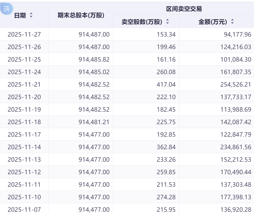 据市场数据显示,港股整体卖空金额从11月20日的588.05亿港元大幅回落至27日的366.39亿港元,降幅达37.7%。同时,参与卖空交易的个股数量也从20日的840家减少至27日的795家,市场看空情绪明显降温。