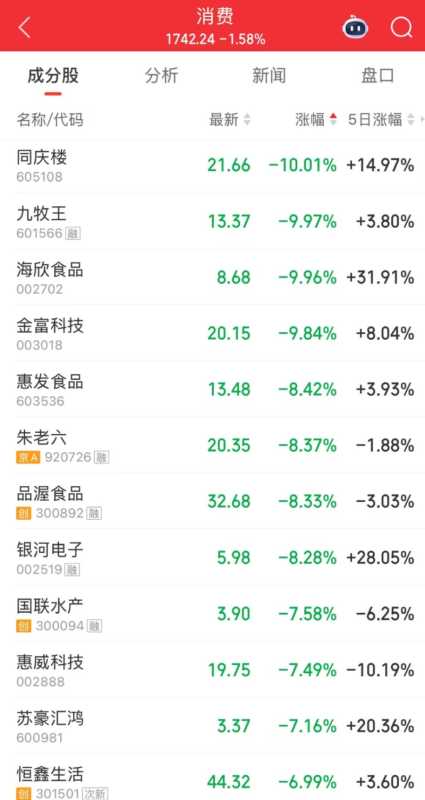 大消费板块调整:今日,大消费板块中食品、乳业等多个分支概念走弱。同庆楼、海欣食品等前期大涨股均跌停。惠发食品、朱老六、品渥食品等跌幅居前。