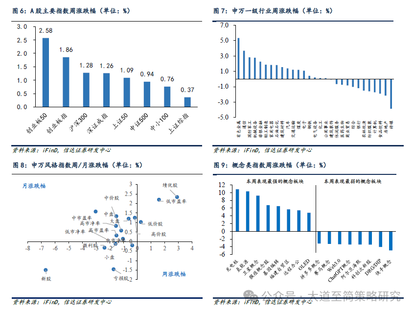 本周市场变化:本周A股主要指数全部上涨。申万行业中,有色金属、通信、国防军工领涨。