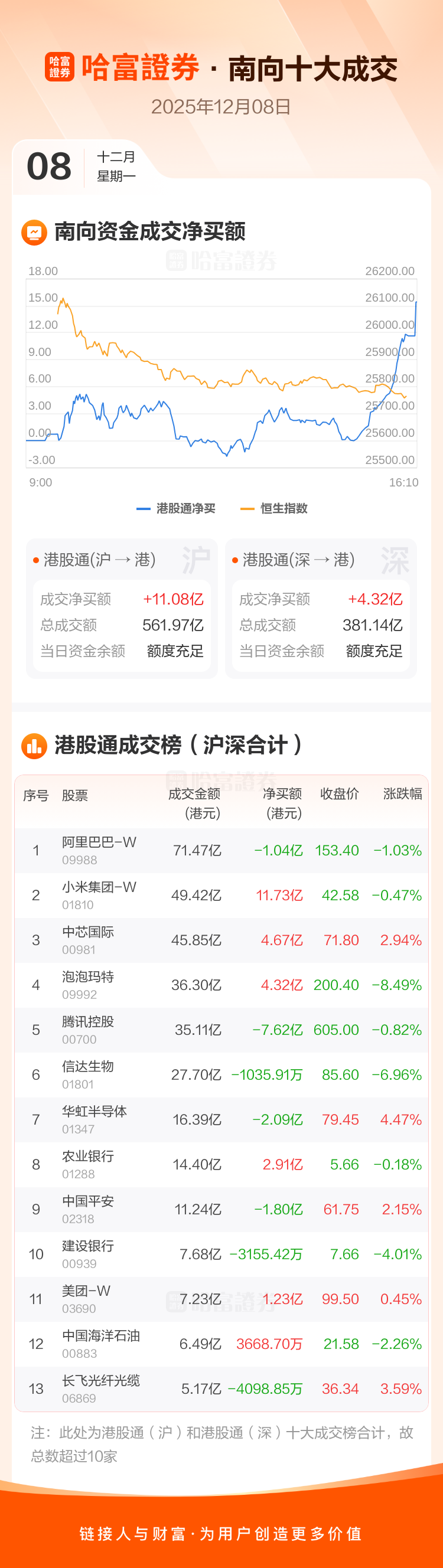 恒生指数12月8日跌1.23%,南向资金净买入港股15.40亿港元。详细成交情况如何?AI生成内容仅供参考,不构成投资建议。