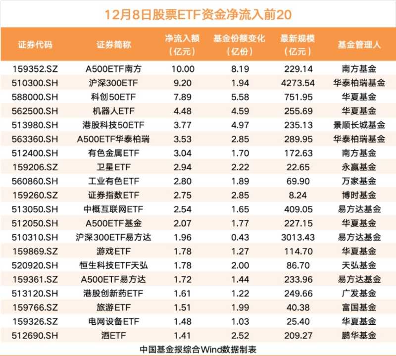 具体来看,12月8日共有29只ETF资金净流入超1亿元。其中,A500ETF南方以10亿元资金净流入排在第一位,华泰柏瑞基金旗下沪深300ETF、华夏基金旗下科创50ETF分别以9.2亿元、7.89亿元的净流入排在第二位、第三位。