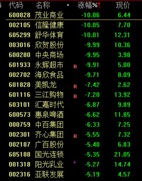 下跌方面,零售板块调整,茂业商业、中央商场、永辉超市跌停。消息面上,飞天茅台跌破指导价。白酒价格平台“今日酒价”数据显示,2025年12月12日飞天茅台散装单瓶的参考价为1485元/瓶,跌破1499元/瓶的官方指导价;2025年飞天茅台原箱单瓶的参考价为1495元/瓶,同样低于指导价。