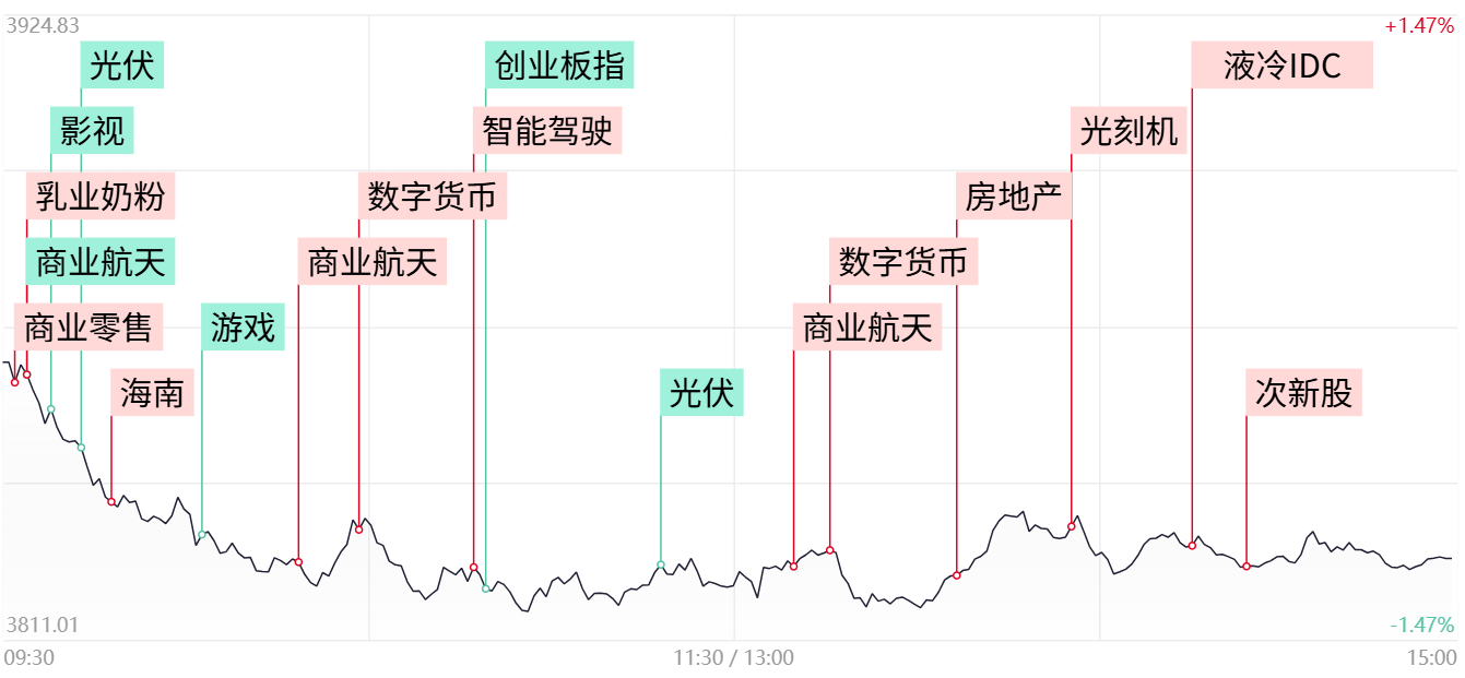 市场全天震荡调整,三大指数集体低开低走。零售板块全天强势,商业航天概念也于午后探底回升。同时需关注市场热点如智能驾驶的走势。