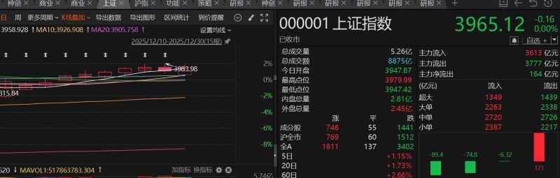 今日(12月30日)是A股2025年倒数第二个交易日。沪指今日几乎平收,日K线“十连阳”,收报3965.12点;深证成指涨0.49%,收报13604.07点;创业板指涨0.63%,收报3242.90点。