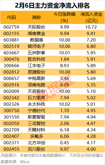 从个股看,40股主力资金净流入超2亿元,天际股份、湖南黄金等13股获主力资金净流入超5亿元。