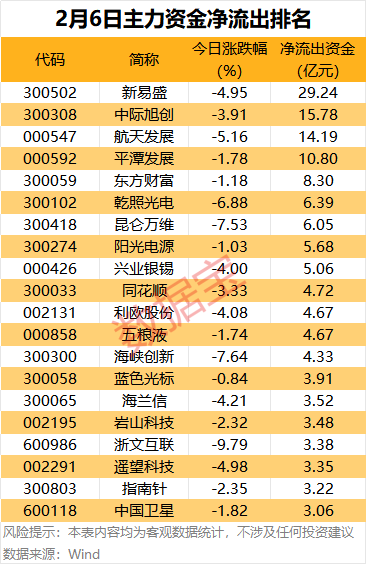 44股主力资金净流出超2亿元,其中,新易盛、中际旭创等净流出金额居前。