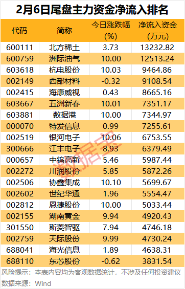 个股方面,北方稀土、洲际油气尾盘主力资金净流入均超1亿元。