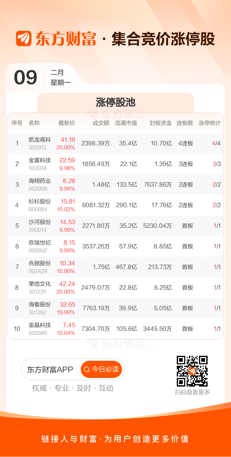 个股方面,16股竞价涨停,其中凯龙高科4连板、金富科技3连板、海翔药业2连板、杉杉股份2连板、沙河股份首板。