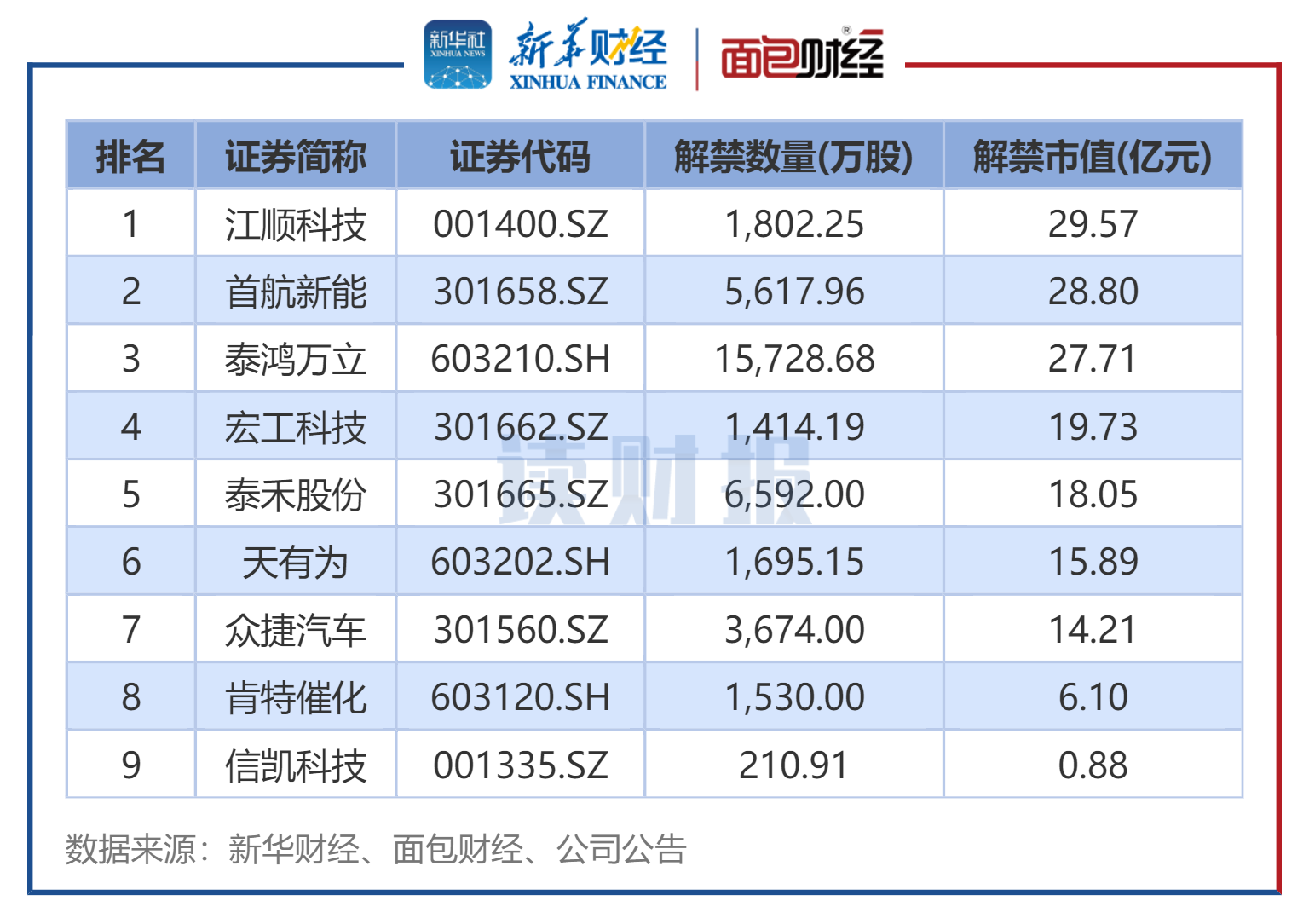 其中,江顺科技解禁规模居首,解禁市值约为29.57亿元。首航新能、泰鸿万立的上市周年解禁规模紧随其后,分别为28.8亿元、27.71亿元。