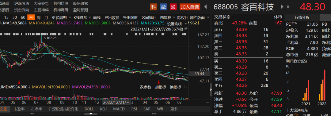 从容百科技的股价走势看,葛卫东买入之后就开始持续下跌。2022年7月,容百科技股价最高为167.23元/股(前复权价),最新股价则跌至48.3元/股,跌幅超过70%。