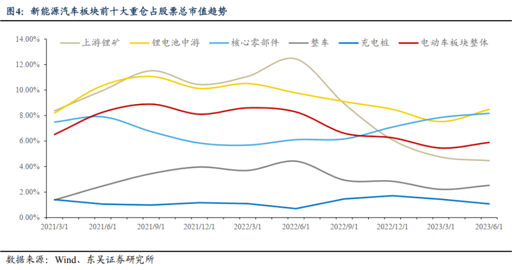 东吴证券根据公募基金季报的测算数据显示,截至今年二季度末,光伏板块持仓占总市值比重下降至6.12%,环比减少0.64个百分点。而新能源汽车板块方面,基金总体持仓占总市值比重为5.89%,环比上升0.44个百分点。