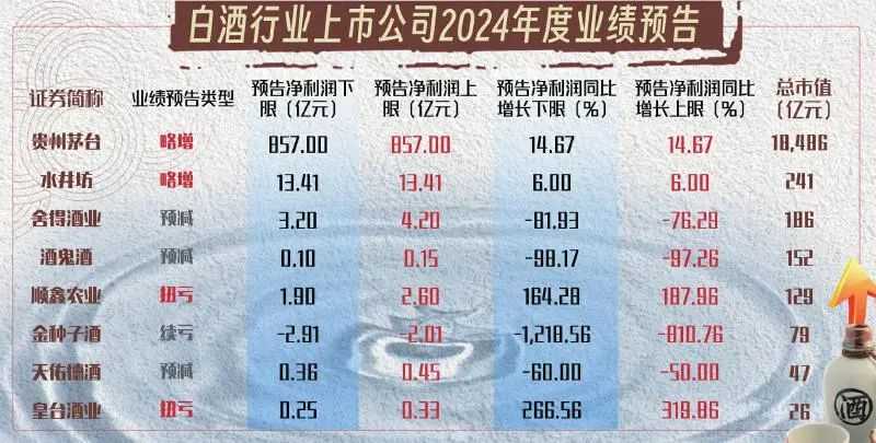 从上市酒企2024年年度业绩预告来看,贵州茅台和水井坊预计2024年业绩“略增”,顺鑫农业和皇台酒业预计实现“扭亏”,舍得酒业、酒鬼酒和天佑德酒业绩“预减”,金种子酒预计业绩“续亏”,整体表现分化明显。