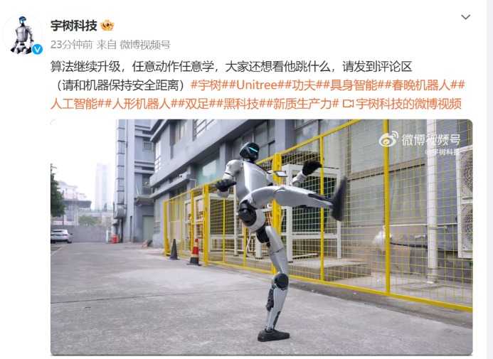 2月25日,宇树科技更新了一则名为“功夫BOT:宇树G1”的视频,展示了随着算法升级,机器人能够任意学习并流畅施展高难度武术动作,如挥拳和旋踢。