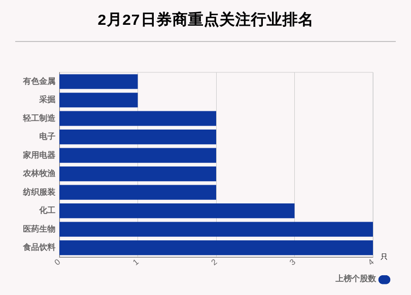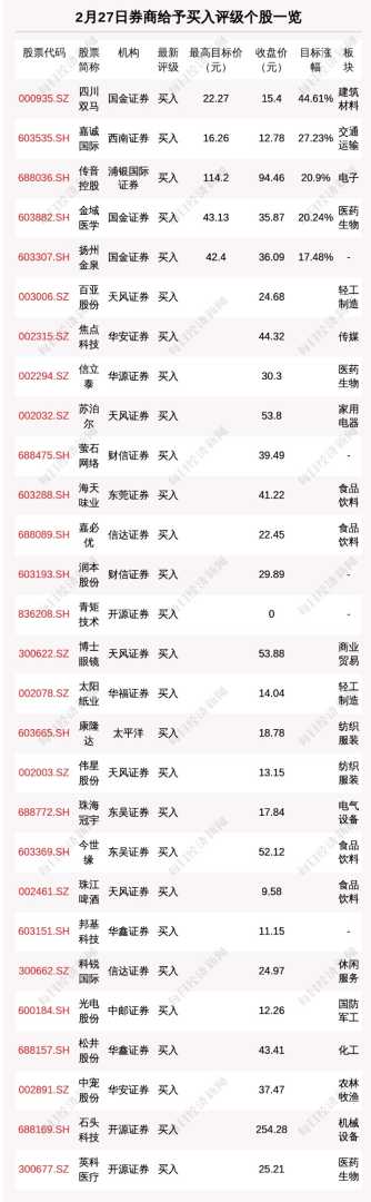 2月27日,券商给予评级的个股数达43只,其中28只获得买入评级。预期涨幅排名前三的个股为四川双马、嘉诚国际、传音控股。券商对食品饮料、医药生物、化工等行业个股关注度较高。