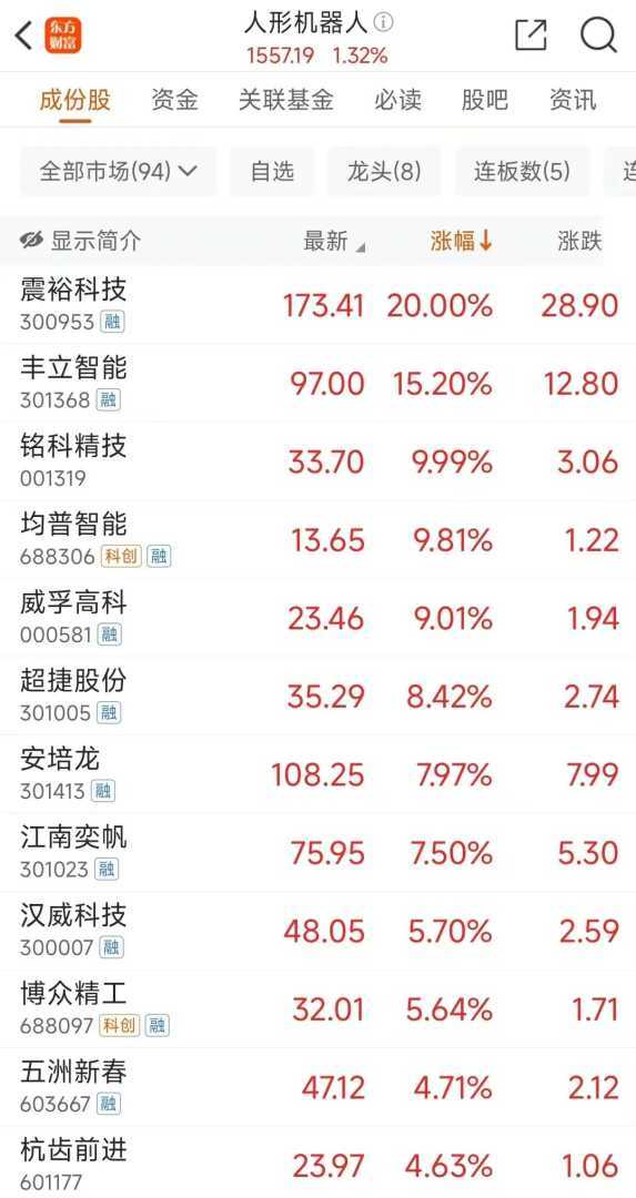 周五人形机器人板块逆势走高,收盘时上涨1.32%。铭科精技涨停收盘,丰立智能大涨超10%,均普智能、威孚高科、超捷股份也明显上涨。此外,机器人产业链相关板块如机器人执行器、减速器等也纷纷走强。