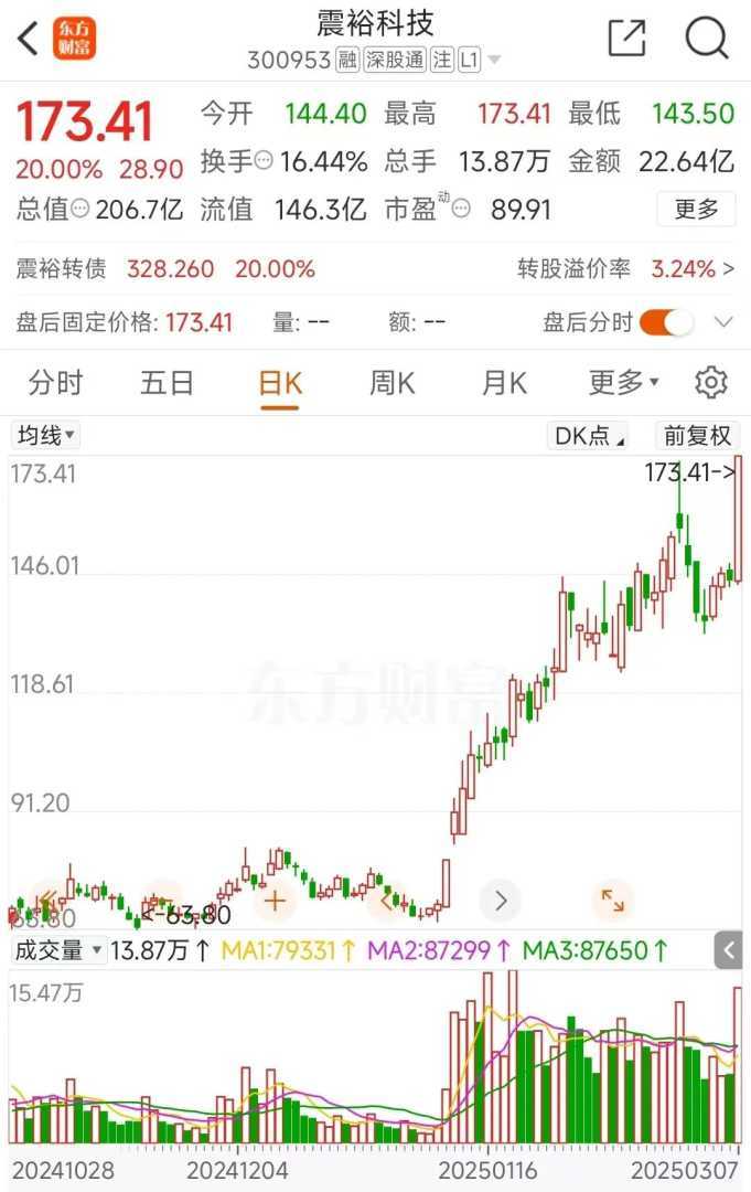 专业从事精密级进冲压模具及下游精密结构件研产销的震裕科技周五低开高走,触及涨停并封死涨停板,最新收盘价创历史新高,市值达206.7亿元。今年以来,震裕科技累计上涨超149%。