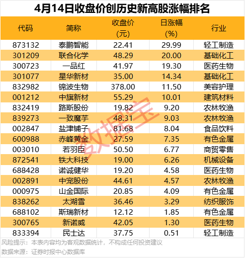 人民财讯4月15日电,不含近一年上市的次新股,昨日共有19只个股收盘价创历史新高。从行业分布来看,有色金属、医药生物、农林牧渔行业创新高的个股较为集中,三大行业均有3只个股名列其中。这些个股的股价呈现出不断攀升的态势,展现出强劲的市场表现。