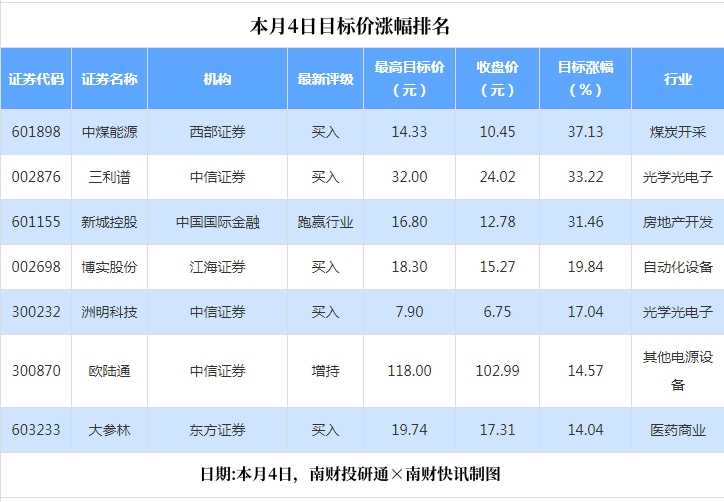 4日,多家券商为上市公司设定了目标价,共计7次。按照当日的收盘价进行计算,目标价涨幅排名前三的公司分别为中煤能源、三利谱、新城控股,涨幅分别达到37.13%、33.22%、31.46%,这三家公司分别隶属于煤炭开采、光学光电子、房地产开发行业。